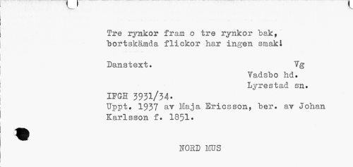 //// Tre rynkor fram o tre rynkor bak, bortskämda flickor har ingen smak! //// Danstext. 7g //// Vadsbo hd. Lyrestad sn. //// IFGH 3931/34. //// Uppt. 1937 av Maja Ericsson, ber. av Johan Karlsson f. 1851* //// NORD MUS ////