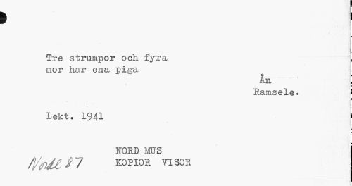 //// > //// - //// Tre strumpor och fyra mor har ena piga //// in [ //// Ramsele. ) //// i k //// J //// Lekt. 1941 I //// i //// | //// HORD MUS /j/fflli / 7 KOPIOR VISOR ////