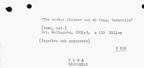 //// * //// "Tre vackra flickor uti en ring, faderalla" //// .' ...--i-..-- //// (text, mel.) //// Dal. Malingsbo, 2001:3, s 110 Hällen (ingefära och pepparrot) //// D 126 //// U L M A SÅNGLEKAR ////