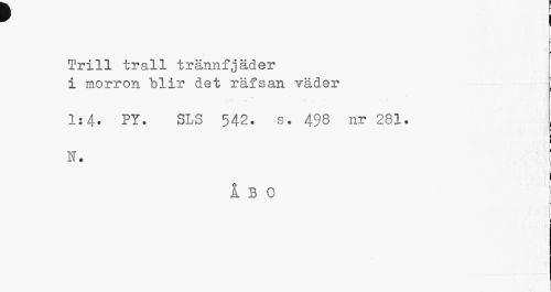 //// w //// I //// Trill trall trännfjäder i morron blir det räfsan väder //// 1:4. PT. SLS 542. s. 498 nr 281. //// i //// N. //// t I //// ÅBO I //// t //// I //// I ////