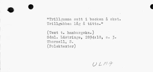 //// • • . . . » //// "Trillgumma satt i "backen å sket. Trillgubben låg å titta.11 //// (Text t. hamburgska.) //// Sdml. Lästringe, 2894:18* s. 3. //// Thornell, S. //// (Pclsktexter) //// U LWf ////