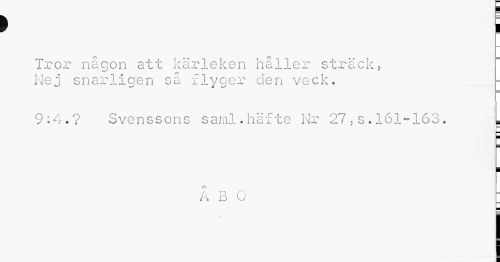 //// > //// Tror någon att kärleken håller sträck, //// Nej snarligen så flyger clen veck. ...= //// 9:4.? Svenssons saml.häfte Nr 27,s.161-163. , //// ¦ //// a b o : ////