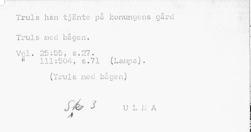 //// Truls han tjänte på konungens gård //// Truls mecl bågen. //// Vgl. 25:55, s.27. " 111:504, s.71 (Lampa). //// (Truls med bågen) //// J 3 U L M A //// <* //// ¦ //// i //// i ////