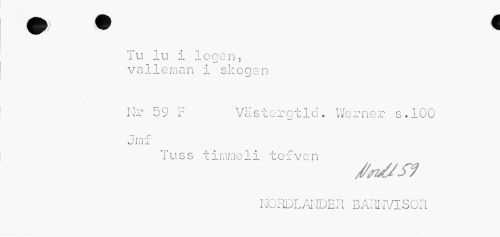 //// Tu lu i logen5 valleman i skogen //// Nr 59 F Västeratld. Werner s.100 //// v-' //// Jmf //// Tuss timmeli tofven //// NORDLANDE R BARI NI SOR ////