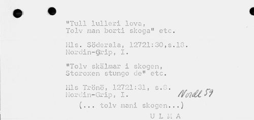 //// "Tull lulleri lova. Tolv man borti skoga" etc. //// Hls. Söderala, 12721:30,s.18. //// Nordin-Grip, I. //// "Tolv skälmar i skogen, Storoxen stungo de" etc. //// Hls Trönö, 12721:31, s.8. Nordin-Grip, I. /I/Oldi * 1 //// ( . . . tolv mani skogen...) //// U L M A ////