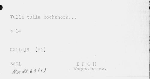 //// > i //// Tulla tulla bockahorn... //// s 14 //// ¦ //// i ¦ //// Källsjö (Kl) i //// 3601 I F G Ii //// /l/cqMé^d) Vaggv.barnv. ////