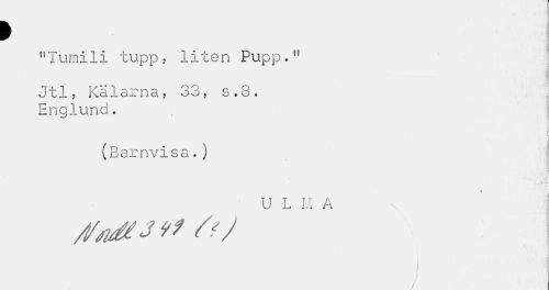 //// > //// "Tumili tupp, liten Pupp." Jtl, Kälarna, 33, s .8. //// Englund. //// (Barnvisa.) //// | //// U L M A //// Sates v? />/ //// i i //// / //// / 1 A \ ////