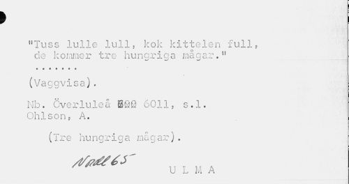 //// ? //// HTuss lulle luli? kok kittelen full, //// de kommer tre hungriga magar.11 • •••••• //// (Vaggvisa). //// Nb. Överluleå 800 6011, s.l. Ohlson, A. //// (Tre hungriga måg ar). //// ' U L M A ////