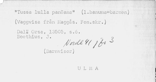 //// "Tussa lulla panGama" (l.banuma=barnen) //// (Vaggvisa från Maggås. ron.skr,} //// Dalä Orsa5 13505, s.6. Boethius, J. r ? //// //irUe fy /fr 6 //// (Barnvisor) //// U L M A | //// ¦ //// ¦ ////