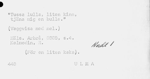 //// 9 //// "Tussa lulla, liten kinn, tjäna mig en bulle." //// (Vaggvisa med mel.) //// T T'' 1 C A K-P° COOR C /i i j. O. J_ b . j i- JJ-L Ca ; i.J u O «J , b • . //// Kolmooin, R. ^ //// (För en. liten kaka) . //// 448 U L M A ////
