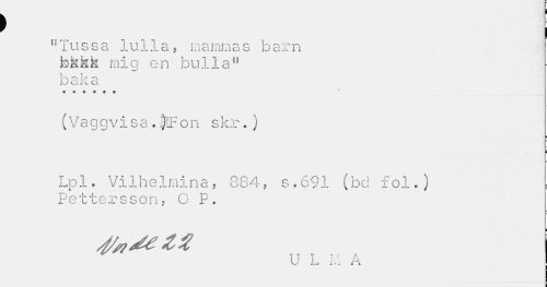 //// ) //// "Tussa lulla, mammas barn fakkk mig en bulla" //// b 3 1C O //// i //// (Vaggvisa.on skr.) //// ¦ //// i //// Lpl. Vilhelmina, 884, s.691 (bd fol.) Pettersson, 0 P. //// U L ivi A ////