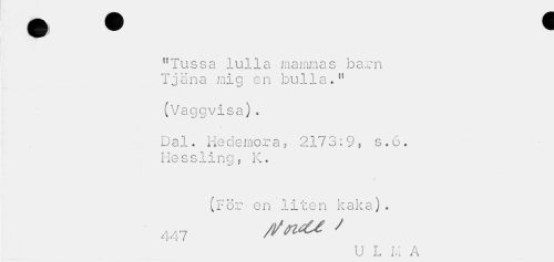 //// "Tussa lulla mammas barn Tjäna mig en bulla." //// (Vaggvisa). //// Dal. Hedemora, 2173:9, s.6. Hessling, K. //// * //// (För en liten kaka). //// 447 ' //// U L U A ////