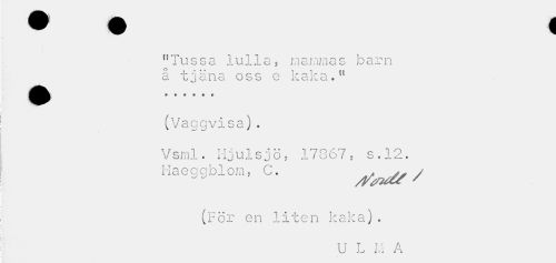 //// "Tussa lulla? mammas barn å tjäna oss e kaka." //// (Vaggvisa). //// Vsml. Hjulsjö? 17867? s.12. Ha eggblom? C. /i/ja<f / //// (För en liten kaka). //// U L Ll A ////