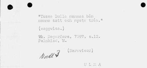 //// "Tusse lulle mammas bån mamma satt och nyste trån." //// (vaggvisa.) //// W>. Degerfors, 7397, s.12. Palmblad, W. //// ij (Barnvisor) //// U L M A ////