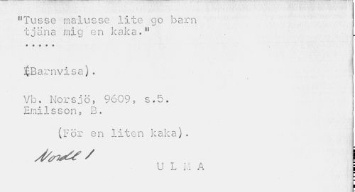 //// f,Tusse malusse lite go barn tjäna mig en kaka." //// « c c t t //// ^Barnvisa). //// Vb. Norsjö, 9609, s.5. Emilsson, B. //// (För en liten kaka). //// J/^f / //// U L i-1 A ////