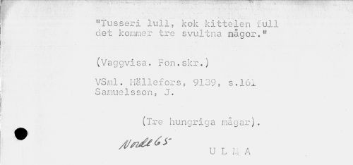 //// "Tusseri lull, kok kittelen full det kommer tre svultna mågor.n //// (Va //// ggvisa. Fon.skr.) //// VSrnl. Hällefors, 9139, s.161 Samuelsson, J. //// (Tre hungriga mågar). //// # ////