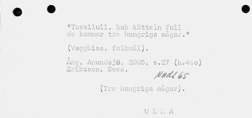 //// "Tussilull, kok kätteln full de kommer tre hungriga mågar.u //// (Vaggbisa, folkmål). //// Ang, Anundsjm, 2005, s.27 (h.4:o) Eriksson, Svea. /y . „ //// (Tre hungriga mågar). //// U L I.I A ////