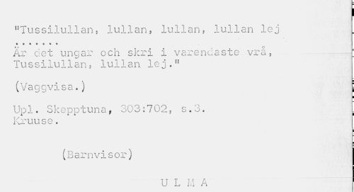 //// I //// "T.ussilullan9 lullan, lullan, lullan lej //// Är det ungar och skri i varendaste vrå, j; //// Tussilullan, lullan. lej." //// (Vaggvisa. ) \ //// ¦ //// Upl. Skepptuna, 303:702, s.3. :| //// Kruuse. //// ¦ ¦ ¦ ¦ //// (Barnvisor) //// U L M A 1 ////