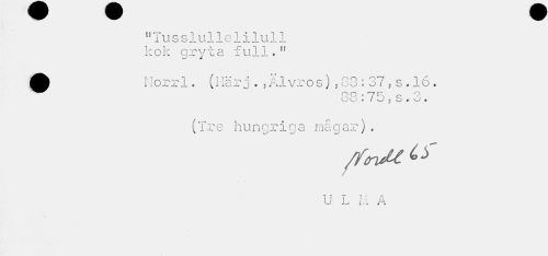 //// f?Tusslullelilull //// kok gryta full." //// A Norrl. (Härj.,Älvros),80:37,s.16. //// ^^ Q o . "7 Ts e O //// O O » ( J 5 o » - • //// (Tre hungriga mågar). //// /fovU f //// U L Ll A ////