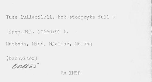 //// luss lullerilull, kok storgryta full - //// insp.ntj. 10660:92 f. j //// Mattson, Niss, Hjalmar, Malung //// (barnvisor) //// RA INSP. //// i ////