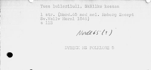 //// Tuss lullerilull, Skällko kossan //// I ¦ //// 1 str. (Nord.65 /ned mel. Moberg Except Sv.Vallv Hornl 1846) s 11B //// i //// DYBECK IJIS FOLKLORE 5 ////