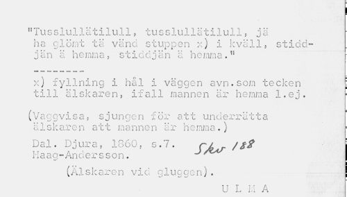 //// "Tusslullätilull, tusslullätilull, jä ha glömt tä vänd stuppen x) i kväll, stidd-jän ä hemma, stiddjän ä hemma." //// x) fyllning i hål i väggen avn.som tecken j //// till älskaren, ifall mannen är hemma l.ej. //// (Vaggvisa, sjungen för att underrätta älskaren att mannen är hemma.) //// Dal. Djura, 1860, s.7. CA.r /j Haag-Andersson. J //// (Älskaren vid gluggen). //// U L M A ////