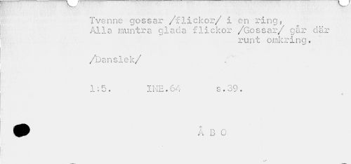 //// Tvenne gossar /flickor/ i en ring, Alla muntra glada flickor /Gossar/ går där //// runt omkring. //// /Danslek/ //// 1:5. INE.64 s.39. //// • o //// / n n jj U ////
