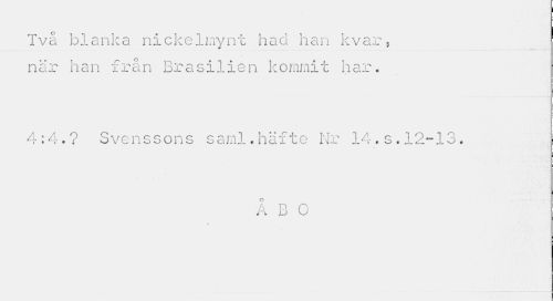 //// 0 //// Två b1anka ni cke1nynt ha o han kvar} när han från Brasilien kommit har. //// 4:4.? Svenssons saml.häfte Nr 14.s.12-13. //// Å B 0 ////