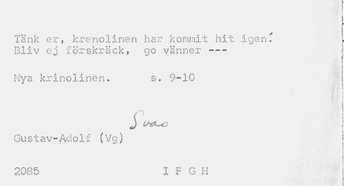//// ] //// Tänk er, krenolinen har kommit hit igen T Bliv ej förskräck, go vänner --- //// i //// Nya krinolinen. s. 9-10 //// - i //// t //// Gustav-Adolf (Vg) j //// 2085 I F G H ////