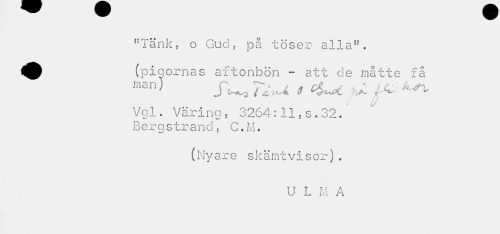 //// "Tänk, o Gud, på töser- alla". ^^ (pigornas aftonbön - att de måtte få //// man' JV-o * ^ i** ^ //// Vgl. Väring, 3264:11,s.32. //// Berg strand. C.M. //// (Nyare skämtvisor). //// U L M A ////