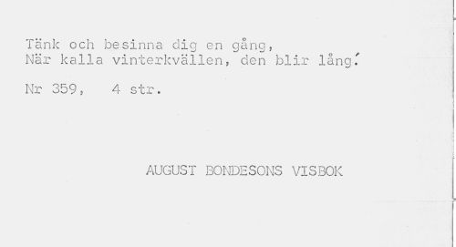 //// Tänk och besinna dig en gång. //// När kalla vinterkvällen, den blir lång T //// Nr 359 5 4 str. //// : //// i « //// i //// i //// i //// AUGUST BONDESONS VISBOK //// T" ////