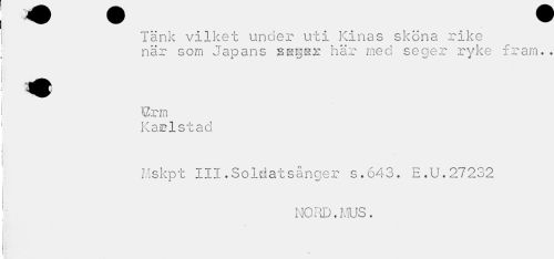 //// Tänk vilket under uti Kinas sköna rike //// när som Japans ssggr här med seger ryke fram.. //// m //// U:cm //// Karlstad //// Mskpt III. Soldat sånger s.643. E.U. 27 2.32 //// NORD.MUS. ////