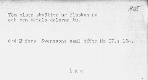//// Töm sista skvätten ur flaskan nu och sen betala'dalarna tu. //// 6:4.S-fors Svenssons saml.häfte Nr 27.s.104. //// ÅBO //// / ////
