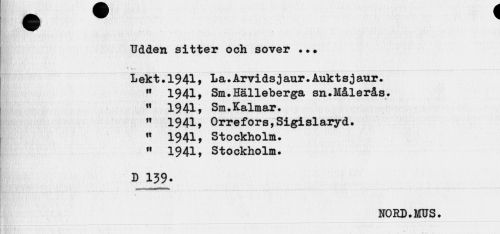 //// Udden sitter och sover •.• //// i //// Lekt . 19419 La.Arvidsjaur, Auktsj aur. n 1941, Sm.Hälleberga sn.Målerås. w 1941, Sm.Kalmar, w 1941, Orrefors,Sigislaryd. « 1941, Stockholm, » 1941, Stockholm. //// B 139» //// NORD.MUS. ////