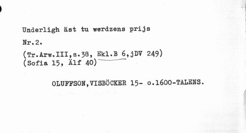//// i x 1 //// i i //// Underligh äst tu werdzens prijs | //// Nr.2. //// (Tr.Årw.III, s. 38, Ekl.B 6,jDV 249) //// (Sofia 15, Älf 40) //// OLUFPSON,VISBÖCKER 15- O.1600-TALENS. //// A fl ////