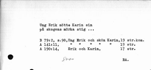 //// ¦ //// Ung Erik mötte Karin sin på skogens mörka stig . • • //// B 79:2, s.98,Ung Erik och skön Karin,19 str.kom. A 141:11, " « M " « 19 str. A 190:14» Erik och Karin, 17 str. //// " j^W-o RA. ////
