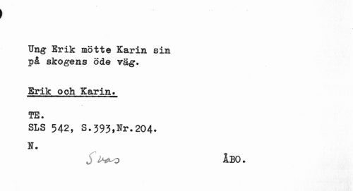 //// Ung Erik mötte Karin sin på skogens öde väg. //// Erik och Karin. TE. //// SLS 542, S.393,Nr.204* //// N. //// S l^O ÅBO. ////