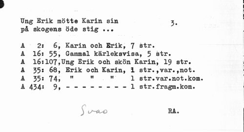 //// r l //// ¦ //// - - - i; //// Ung Erik mötte Karin sin på skogens öde stig ... //// A 2: 6, Karin och Erik, 7 str. //// A 16: 55, Gammal kärleksvisa, 5 str. [ //// A 16:107,Ung Erik och skon Karin, 19 str» t //// A 55: 68, Erik och Karin, i str.,var.,not. A 35* 74, " tt ft 1 str* var »not. kom. A 434: 9, ---1 str.fragm.kom. \ //// ) tA-iJuO RA. ////