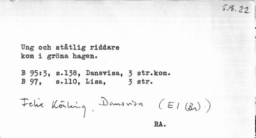 //// ¦ //// I //// i //// i //// Ung och ståtlig riddare //// kom i gröna hagen» //// « . ... - - . . //// % //// B 95:3, s.138, Dansvisa, 3 str.kom» B 97, s.110, Lisa, 3 str. //// s //// ToU lO^ i^j ( -a^^vsVn t / ) i //// EA. ////