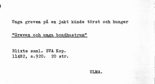 //// I //// Unga greven på en jakt kände törst och hunger "Greven och unga bondhustrun11 //// j i //// Blixts saral» SVA Kop. 11482, 8.920. 20 str. //// r //// ULMA. //// t ////