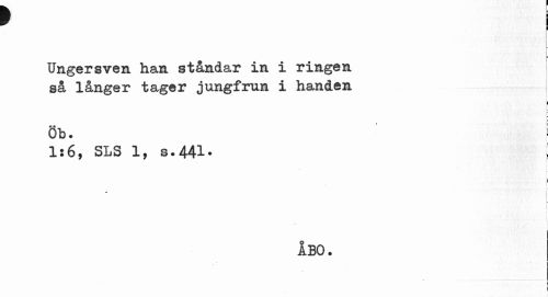 //// ' i //// i //// Ungersven han ståndar in i ringen så långer tager jungfrun i handen //// f //// L //// r« //// Ob. //// Is6, SLS 1, S.441. { //// i [ //// i //// 1 j //// 1 //// ÅBO. ////