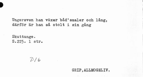//// f j //// Ungersven han växer "båd1 småler och lång, ! //// därför är han så stolt i sin gång //// Skuttunge? S.225. 1 str» //// 7>/<9 //// GRIP,ALLMOGELIV. //// I //// . » - f ////