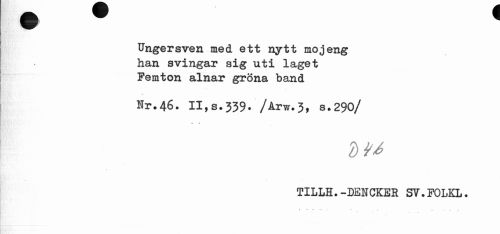 //// Ungersven med ett nytt mojeng han svingar sig uti laget Femton alnar gröna band //// Nr.46. II,s.339» /Arw.3, s.290/ //// h f //// KW //// TILLH.-DENCKER SV.POLKL. ////