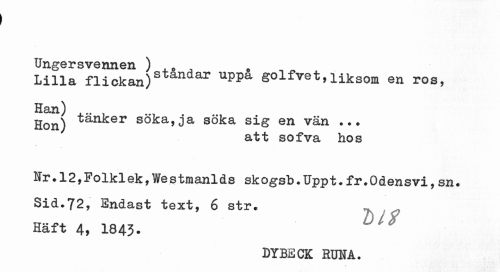 //// Ungersvennen ) . Ä //// Lilla flickan) n Uppå Solfvet>liksom en ros, //// Hon] ^nker söka,ja söka sig en vän ... //// att sofva hos //// Nr.12,Folklek, We s tmanlds sk ogsb.Upp t.fr.0 den svi,sn. Sid.72, Endast text, 6 str. //// Häft 4, 1843- //// DYBECK RUNA. ////