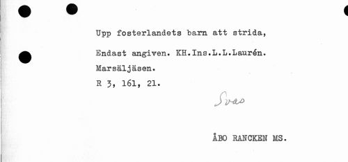 //// il ^^^^ //// Upp fosterlandets barn att strida, //// ^^ Endast angiven. KH.Ins.L.L.Laurén. //// Marsäljäsen. R l6l, 21. //// Ji^o //// ÅBO RMCKEN MS. ////