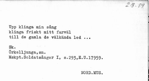 //// Upp klinga min sång //// klinga friskt mitt farväl //// till de gamla de välkända led ?.• //// Sk. //// Örkelljunga,sn. //// Mskpt.Soldatsånger I, s.293,E.U.17959* //// NORD.MUS. J ////