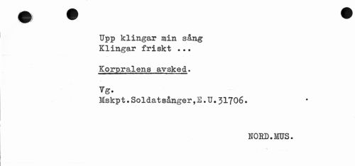 //// f //// Upp klingar min sång Klingar friskt ... //// Korpralens avsked. //// Vg. //// Mskpt.Soldatsånger,E.U.31706. //// NORD.MUS. ////