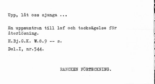 //// Upp, låt oss sjunga ... //// ¦ //// En uppmuntran till lof och tacksägelse för //// * //// återlösning. H.Bj.G.K. W.8.9 -- s• //// Del.I, nr.544* //// ji //// RAHCKEH FÖRTECKSING. ////