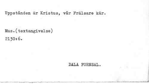 //// Uppstånden är Kristus, vår Frälsare kär. //// Mus.(textangivelse) 2130:6. //// DALA FORNSAL. ////