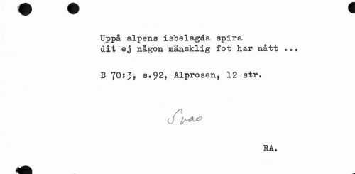 //// W W * //// Uppå alpens isbelagda spira //// dit ej någon mänsklig fot har nått ... //// B 70:3, s.92, Alprosen, 12 str. //// RA. ////